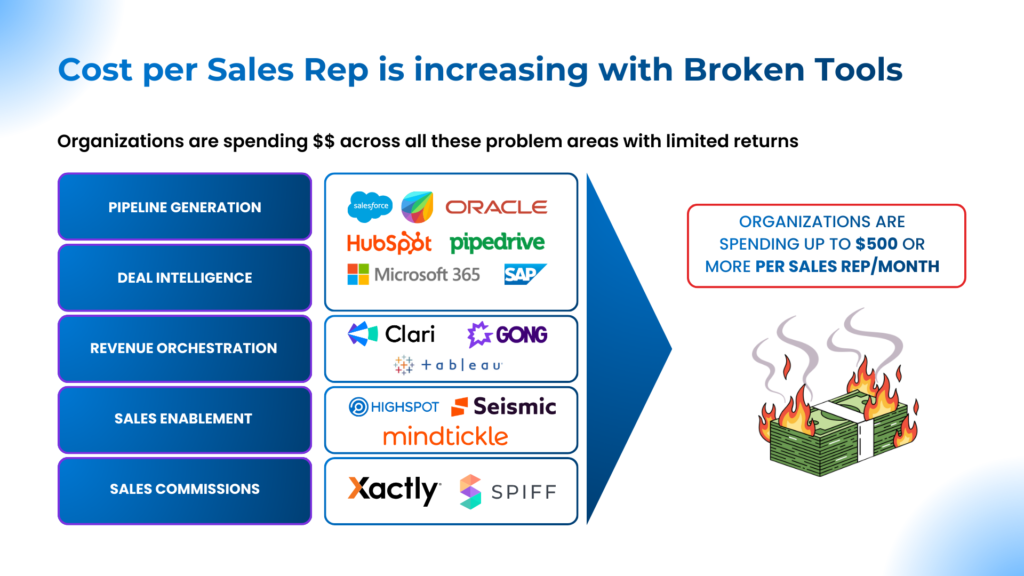 5. High Total Cost of Ownership (TCO): Organizations often rely on multiple point solutions to cover these areas, leading to high operating costs and inefficiencies. Typically organizations would have multiple broken and fragmented tools for sales representatives, increasing the TCO: